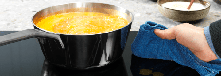 3. Použite mäkkú vlhkú handričku a čistič určený na varné panely (odporúčame ). Nepoužívajte abrazívne čistiace prostriedky alebo drôtenky, pretože môžu poškriabať povrch.
